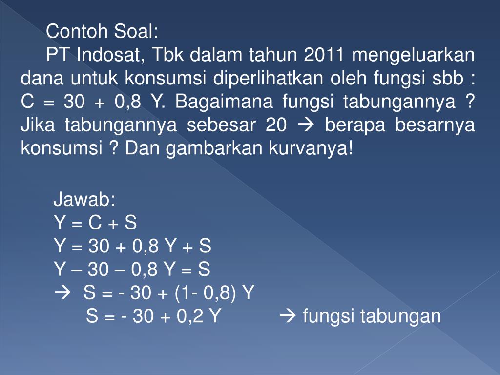 Diketahui fungsi konsumsi c = 15 + 0,7y. Bentuk umum yang menghubungkan konsumsi (c), pendapatan (y), dan mpc adalah. Average prospensity to save (aps). Nilai aps dapat dihitung dg formula : Average propensity to save (aps) perbandingan antara tabungan dengan pendapatan disposabel.